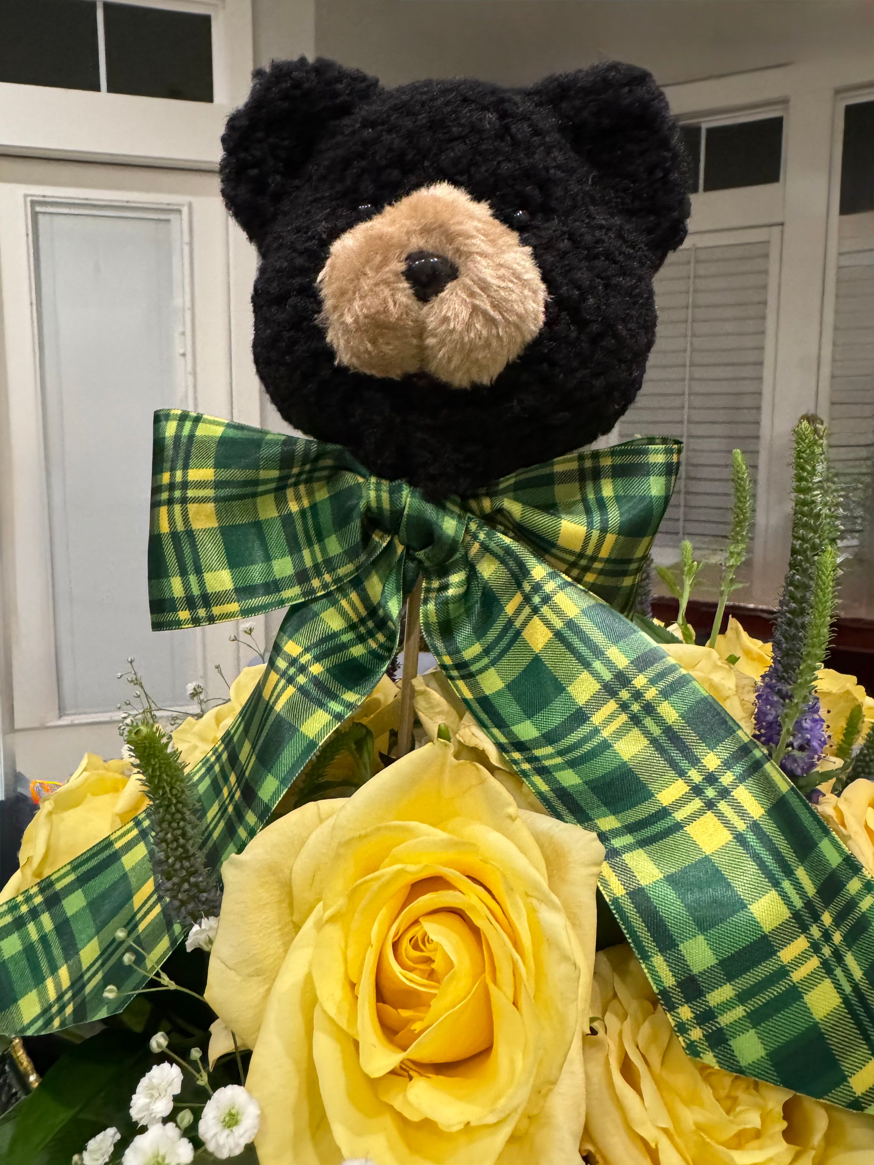 Add a fun and spirited touch to any arrangement with the Fuzzy Bear Stick, featuring a soft plush bear head and the signature Dapper Bear plaid bow. Whether placed in floral bouquets, plants, wreaths, gift baskets, or holiday displays, this adorable accent brings instant personality and Baylor pride to any setting.