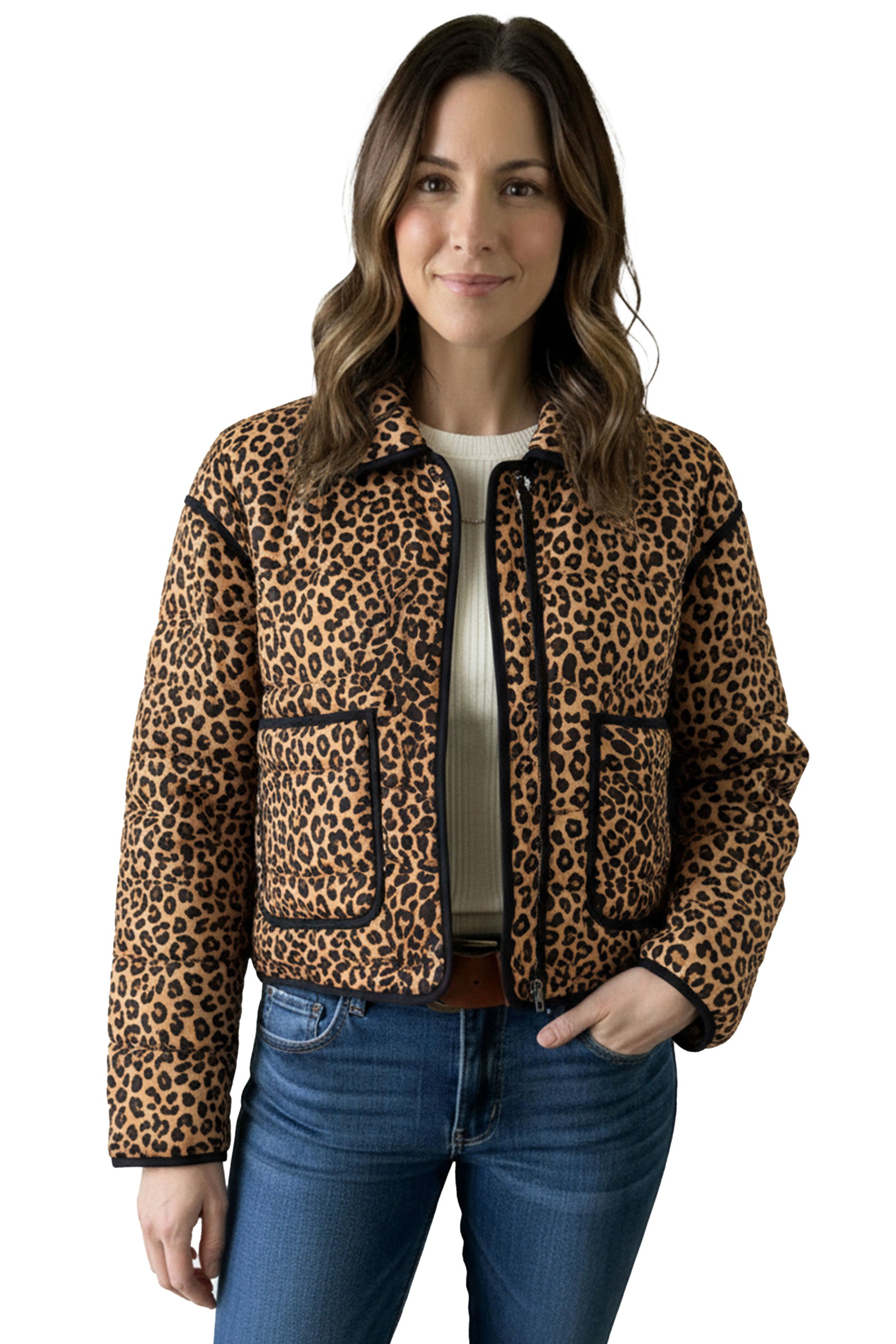 Turn heads and stay warm with this Leopard Puffer Jacket, the perfect mix of wild style and cozy comfort. Featuring a soft quilted body, front pockets, and contrast black trim, this piece brings major personality to your fall and winter wardrobe.