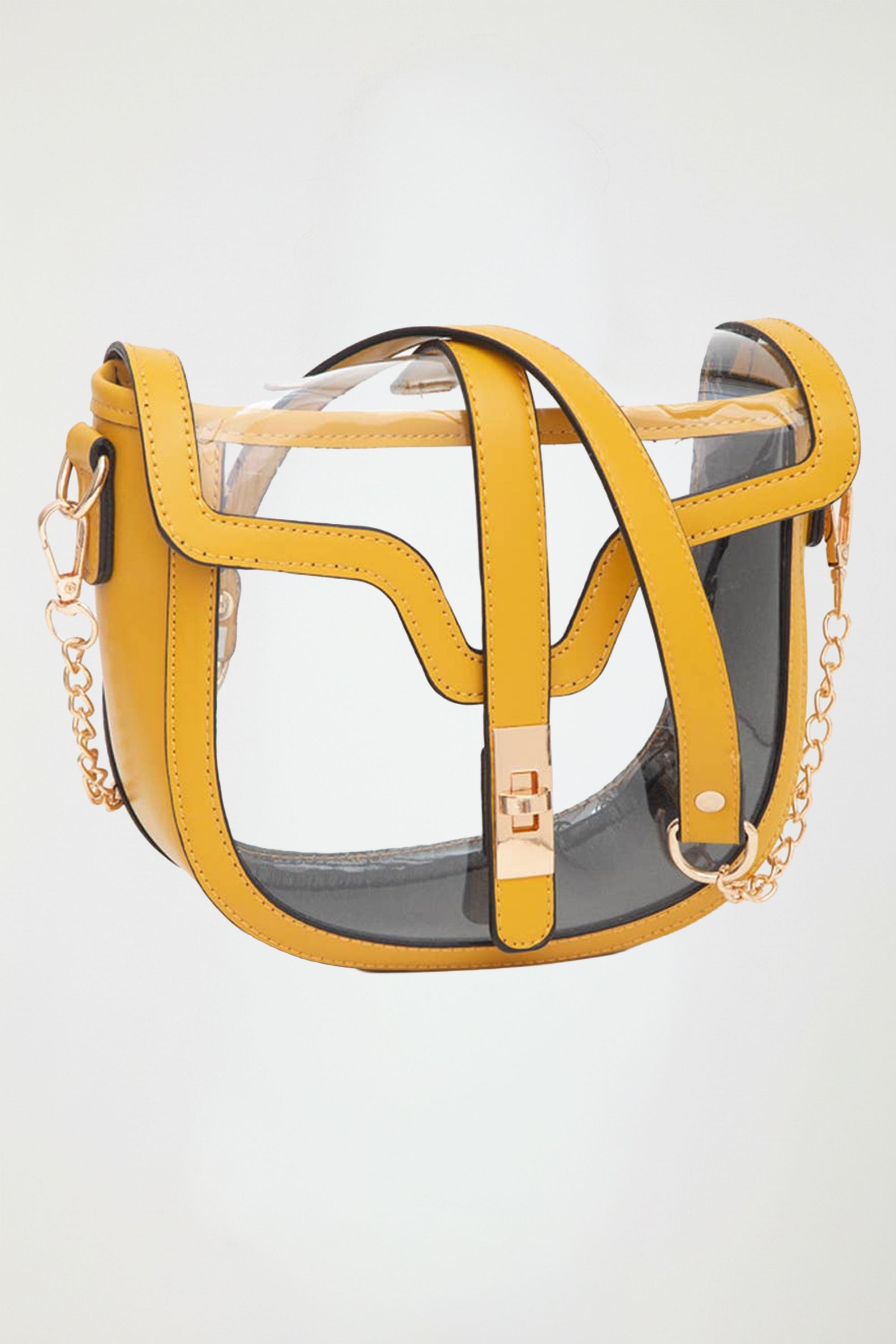 Clear Transparent Saddle Bag • Size : 8" X 7" X 3" • Strap Size : 27" L / Detachable • Turn Closure Clear Crossbody Saddle Bag with Baylor Golden Yellow Trim – Stadium Approved Purse with Gold Hardware & Turn-Lock Closure Step out in style with this clear saddle crossbody bag, perfectly blending elegance and practicality. Featuring rich vegan leather trim, a clear body, and gold-tone chain and hardware accents, this bag is your ideal companion for stadium events, concerts, or nights out. Compact yet functional, this 8" x 7" x 3" bag is designed to fit all your must-haves—phone, small wallet, keys, and lipstick—without bulk. The secure turn-lock closure and saddlebag silhouette add structure and charm, while the detachable gold chain strap provides versatile styling options.