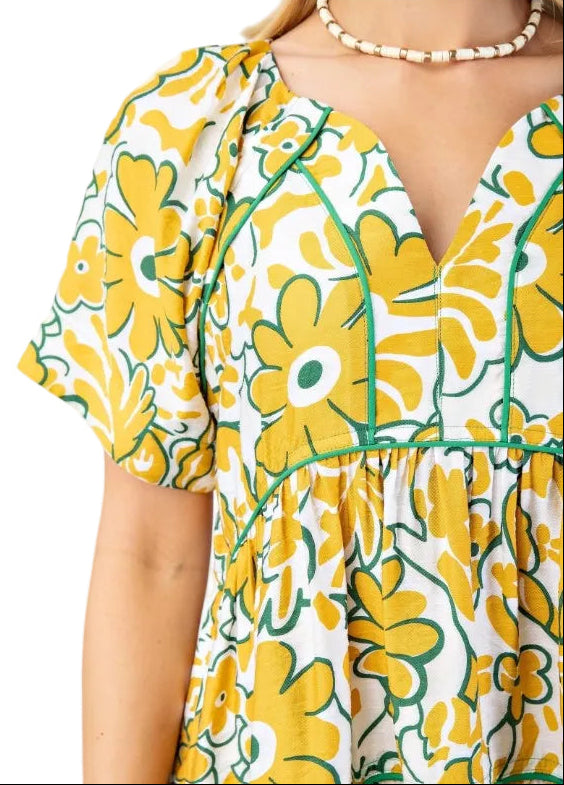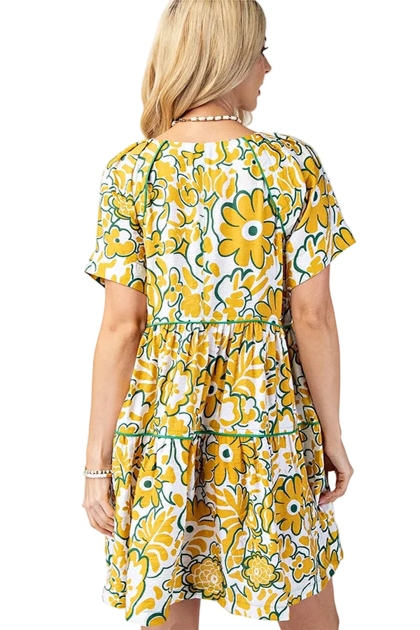 Featuring short sleeves, a flattering open slit neckline, and contrast green binding trim, this dress is finished with striking piped detailing that highlights every tier. The green accents pop against the golden floral print, creating a balanced, eye-catching look that feels festive yet refined.