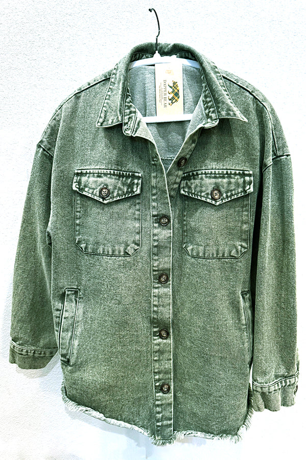 Upgrade your layering game with the Green Wash Denim Jacket, a relaxed-fit essential designed with just the right touch of worn-in charm. Its soft, washed-green denim gives a fresh twist to a classic favorite, while the button-front design, chest pockets, and frayed hem add the perfect mix of structure and laid-back style.