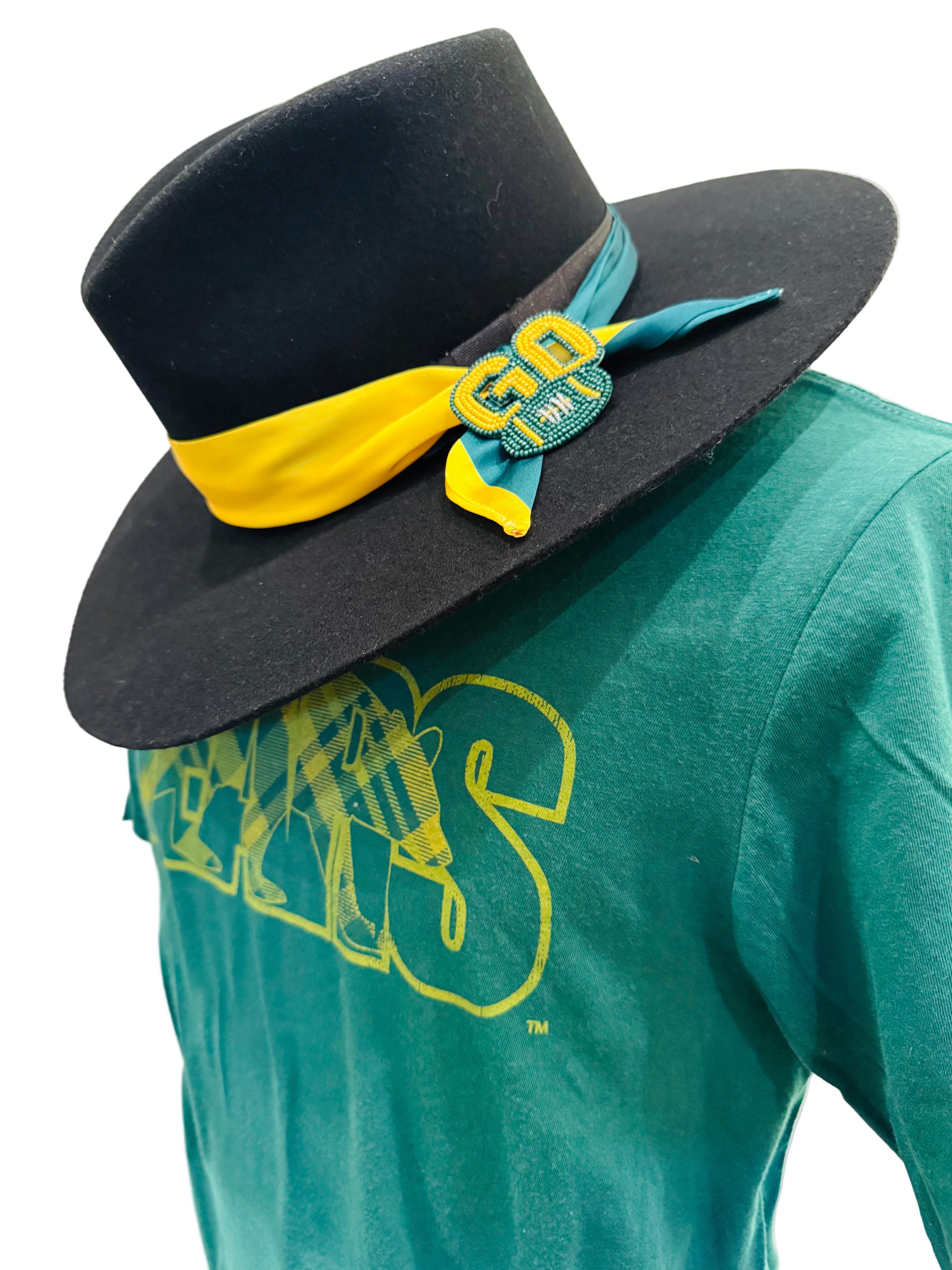 Show your team pride in style with the GO Football Pin, a hand-beaded accessory crafted in vibrant green and gold. Designed to make a statement, this pin adds the perfect pop of game day energy to hats, jackets, bags, scarves, and more.